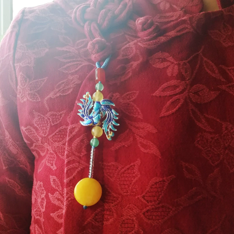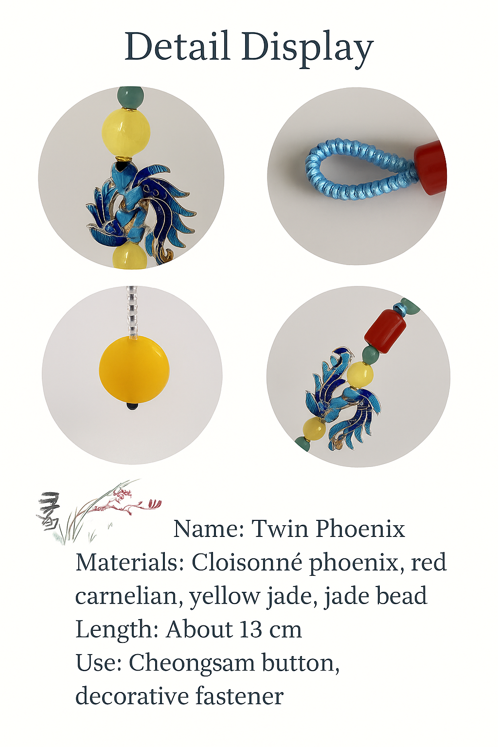 Cloisonné Phoenix Yellow Jade Cheongsam Button Pendant